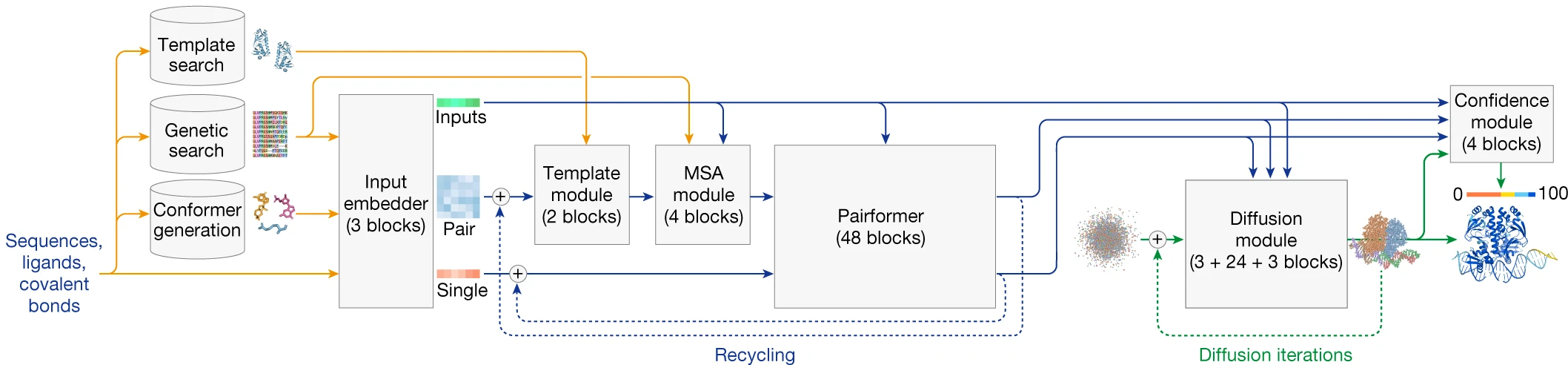 AlphaFold3’s design philosophy diverges sharply from its predecessor. Where AlphaFold2 built protein-specific inductive biases directly into the architecture—residue frames, torsion angle parameterization, SE(3)-equivariant Invariant Point Attention—AlphaFold3 strips these away in favor of a more general approach. The core insight is that many of these constraints, while theoretically elegant, added complexity without proportional accuracy gains and fundamentally limited the system to protein-only prediction.
