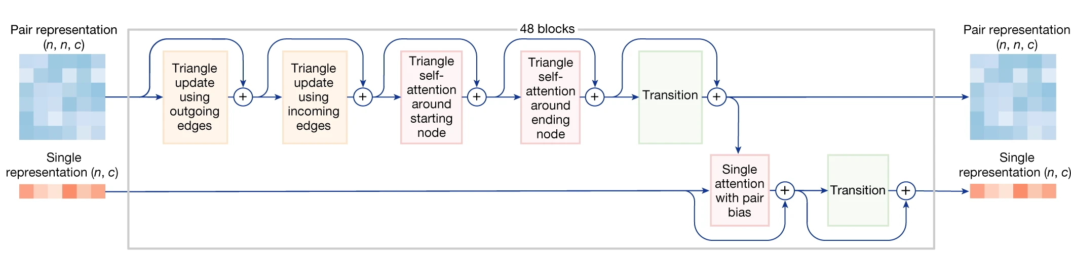 This architectural choice reflects an empirical observation: MSA information, while valuable, can be efficiently compressed early in the pipeline. The dramatic reduction from 48 interlocked Evoformer blocks to 4 dedicated MSA blocks indicates that co-evolutionary signal, once captured, does not require continuous refinement alongside structural representations.