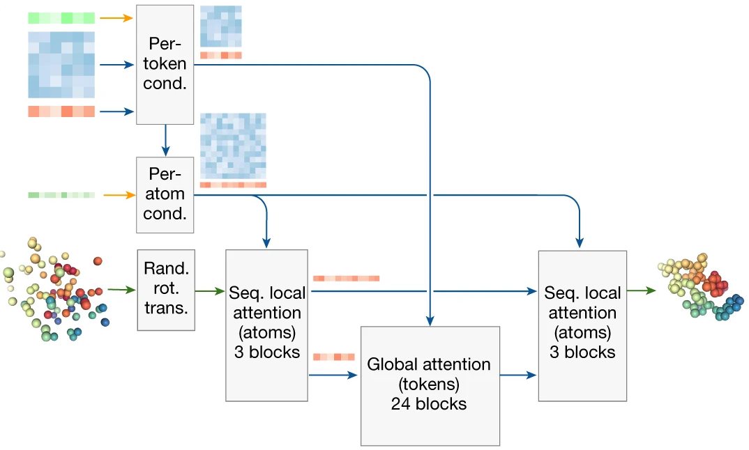 The most dramatic architectural departure from AlphaFold2 is the replacement of the deterministic, equivariant Structure Module with a conditional diffusion model operating directly on raw atomic coordinates. This shift eliminates the need for residue frames, torsion angle parameterization, and explicit SE(3) equivariance—all of which fundamentally limited AlphaFold2 to protein-like molecules with well-defined backbone geometries.