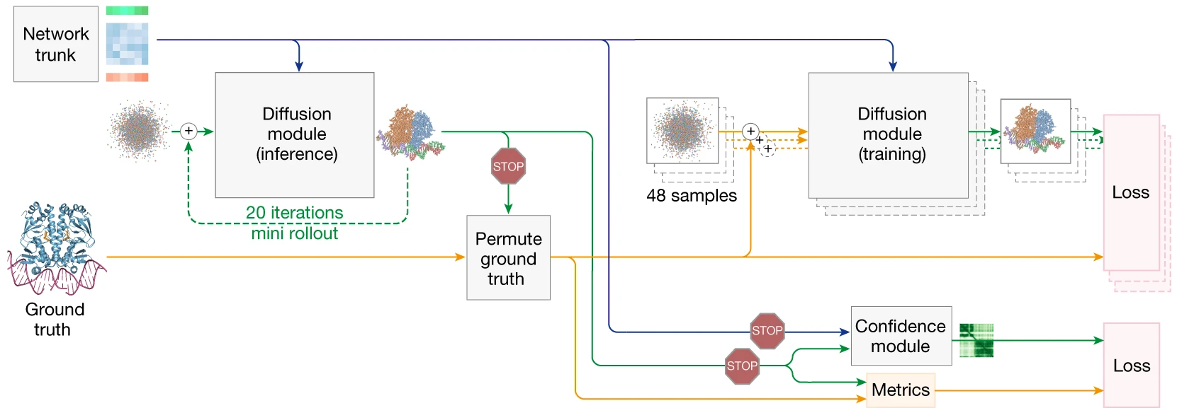 Training exploits the asymmetry between trunk and diffusion costs. The trunk (Pairformer) is computationally expensive; the Diffusion Module is relatively cheap. Therefore, each trunk forward pass generates 48 augmented diffusion samples (random rotations, translations, independent noise), all trained in parallel. This batch expansion enables efficient diffusion training without proportional trunk computation.