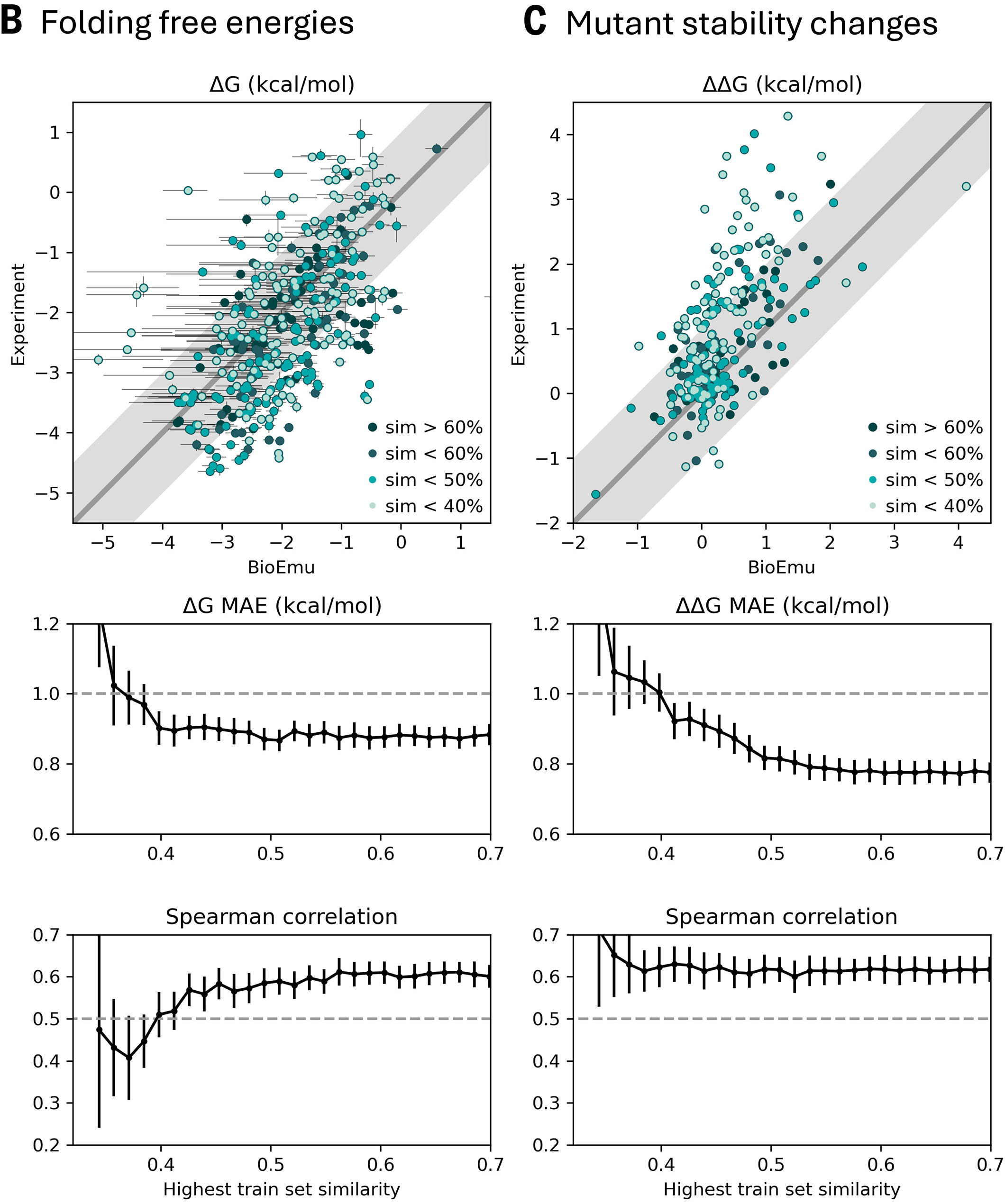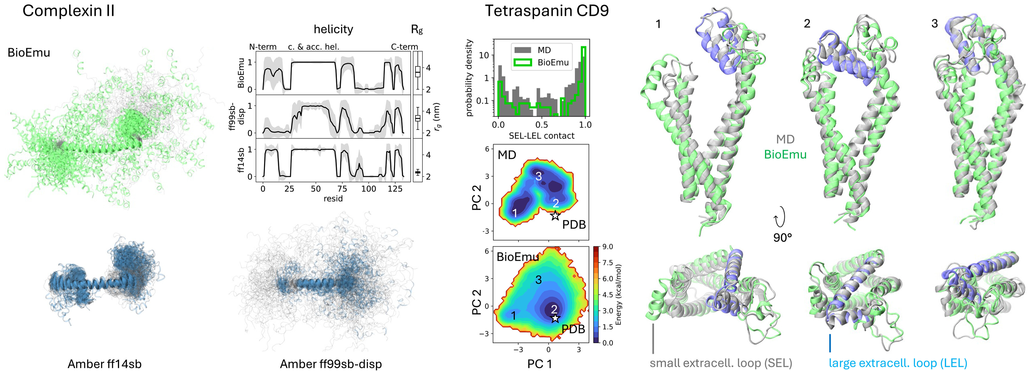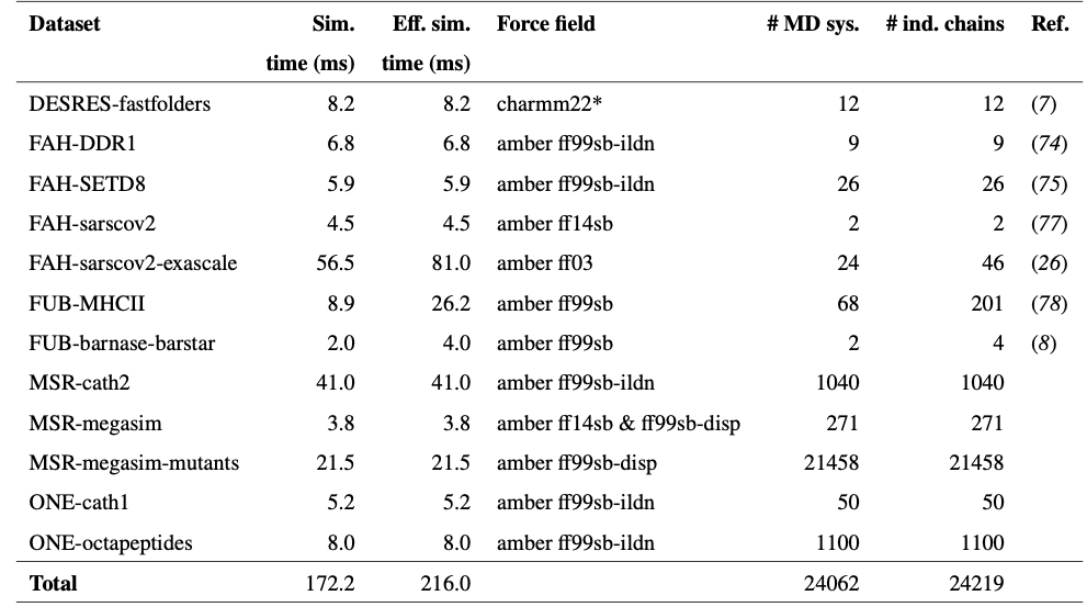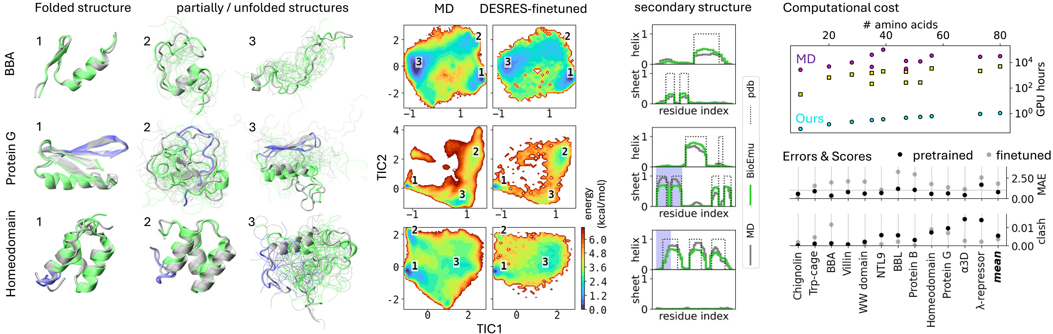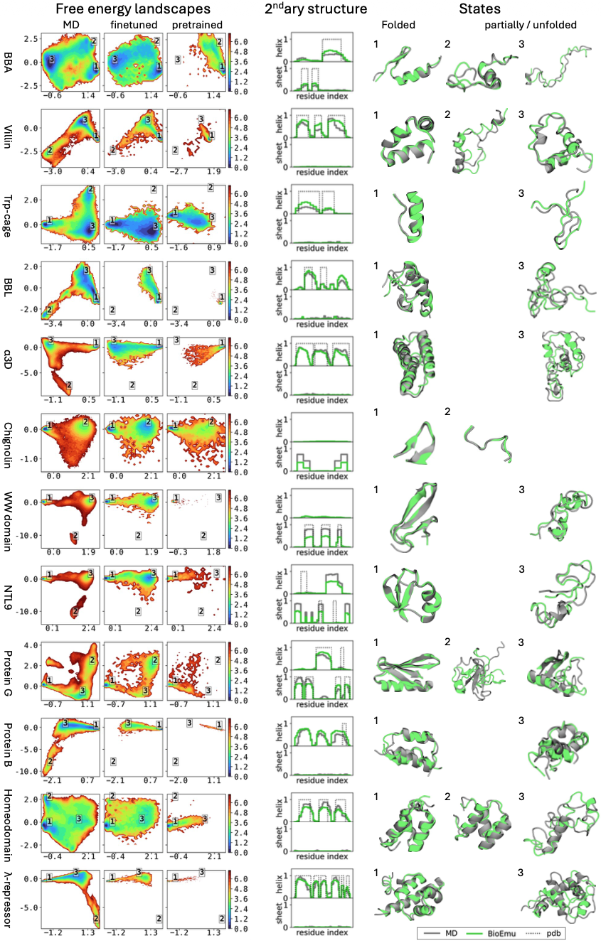 | BioEmu | Diffusion | AFDB+200ms MD+Exp | ~1 kcal/mol | 1.9 |