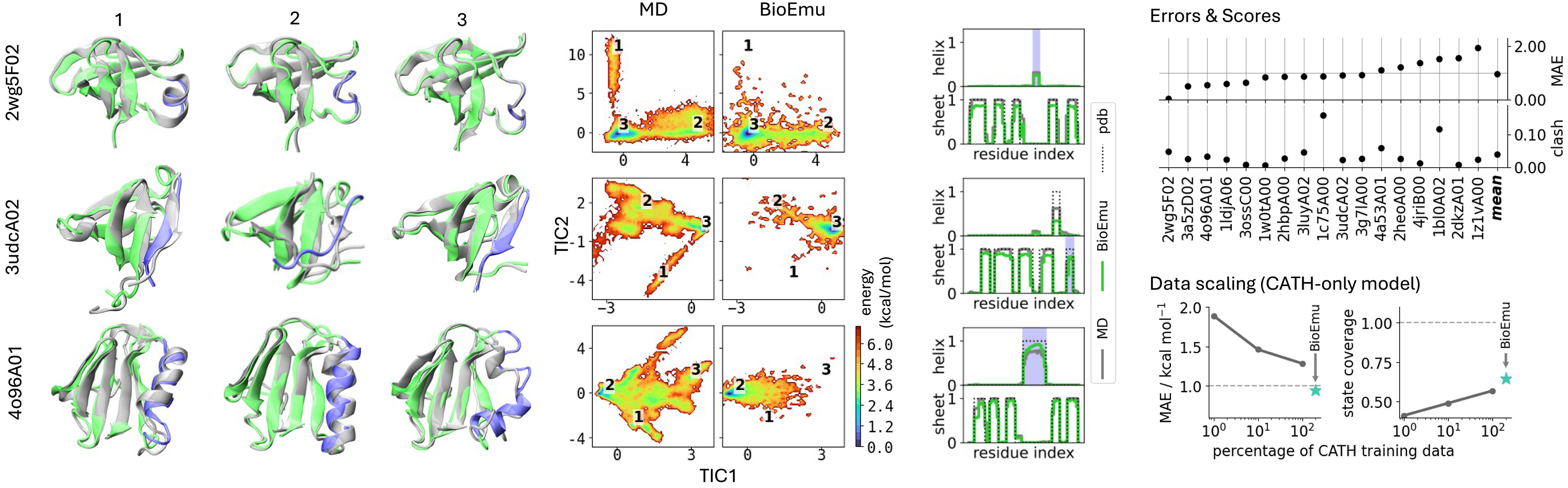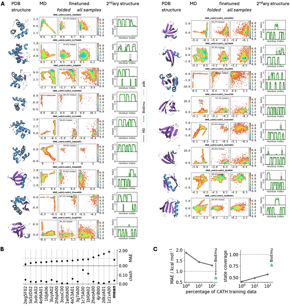 The CATH benchmark demonstrates generalization beyond training proteins. For 1040 CATH domains spanning diverse structural topologies, BioEmu was trained on varying fractions (1%, 10%, 100%) and evaluated on held-out domains. Free energy MAE decreased from ~1.5 to ~1.0 kcal/mol as training data increased, while state coverage improved from ~0.5 to ~0.75, suggesting continued improvement with more simulation data.