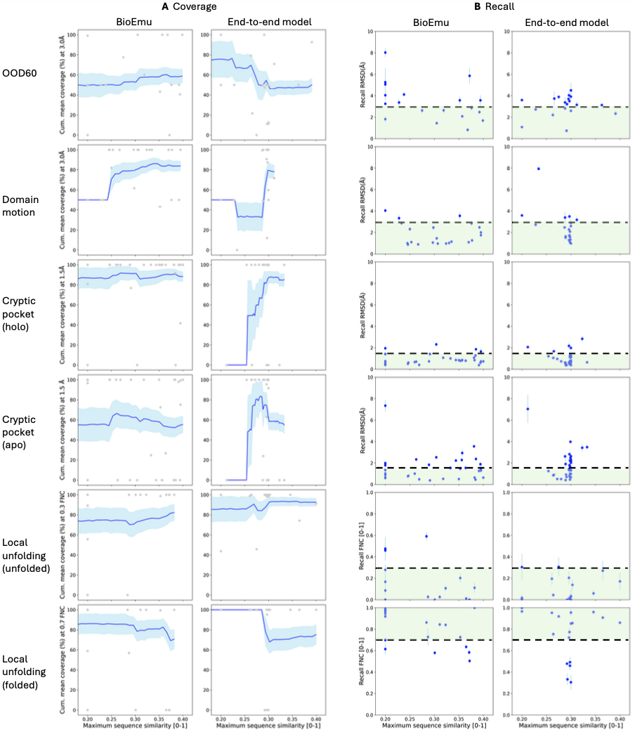 BioEmu leverages AlphaFold2’s Evoformer to compute single and pair representations, invoked only once per protein, then uses ~100 denoising steps with a second-order integration scheme (DPM-Solver) to generate structures. Performance benchmarks show 85% coverage of domain motions, 72-74% coverage of local unfolding states, and 49-85% coverage of cryptic pocket formation—all at ~1.9 GPU-seconds per sample compared to AlphaFlow’s ~32 GPU-seconds.