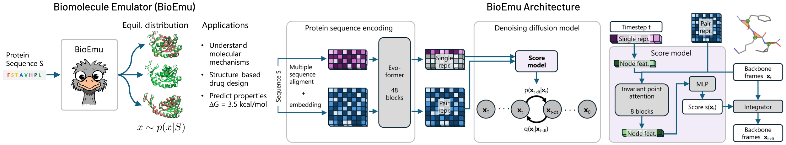 BioEmu represents a genuine breakthrough in computational biology—not as a replacement for MD simulation, but as a complementary tool enabling new scales of hypothesis generation. The combination of AlphaFold-derived sequence encoding, diffusion-based structure generation, and experimental data integration through PPFT achieves what neither pure physics-based simulation nor pure data-driven learning could accomplish alone.