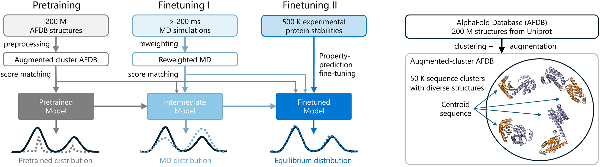 The key architectural innovation is a three-stage training pipeline. First, pre-training on clustered AlphaFold Database structures with data augmentation encourages diverse conformational associations from sequence. Second, continued training on more than 200 milliseconds of aggregate MD simulation data—reweighted using Markov state models to better approximate equilibrium populations—teaches realistic dynamics. Third, and most novel, Property Prediction Fine-Tuning (PPFT) aligns the learned distribution with experimental free energies from the MEGAscale protein stability dataset without requiring structural information for the measured proteins. This enables BioEmu to predict folding stability changes for mutations with remarkable accuracy.