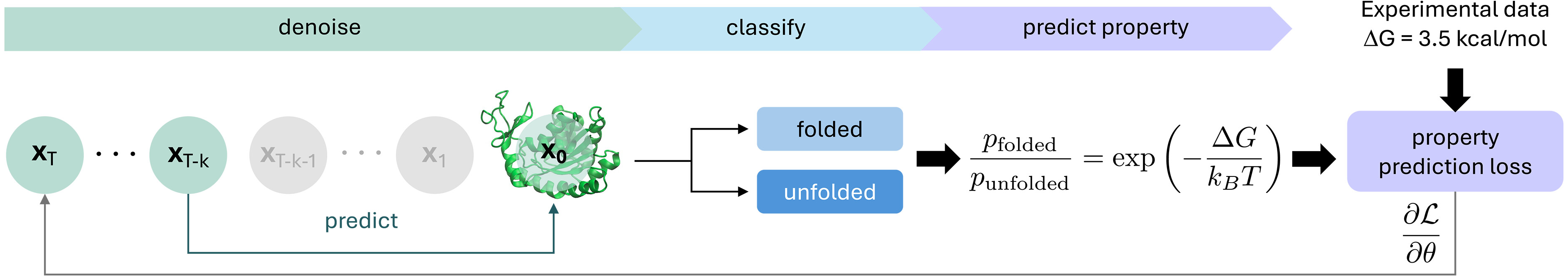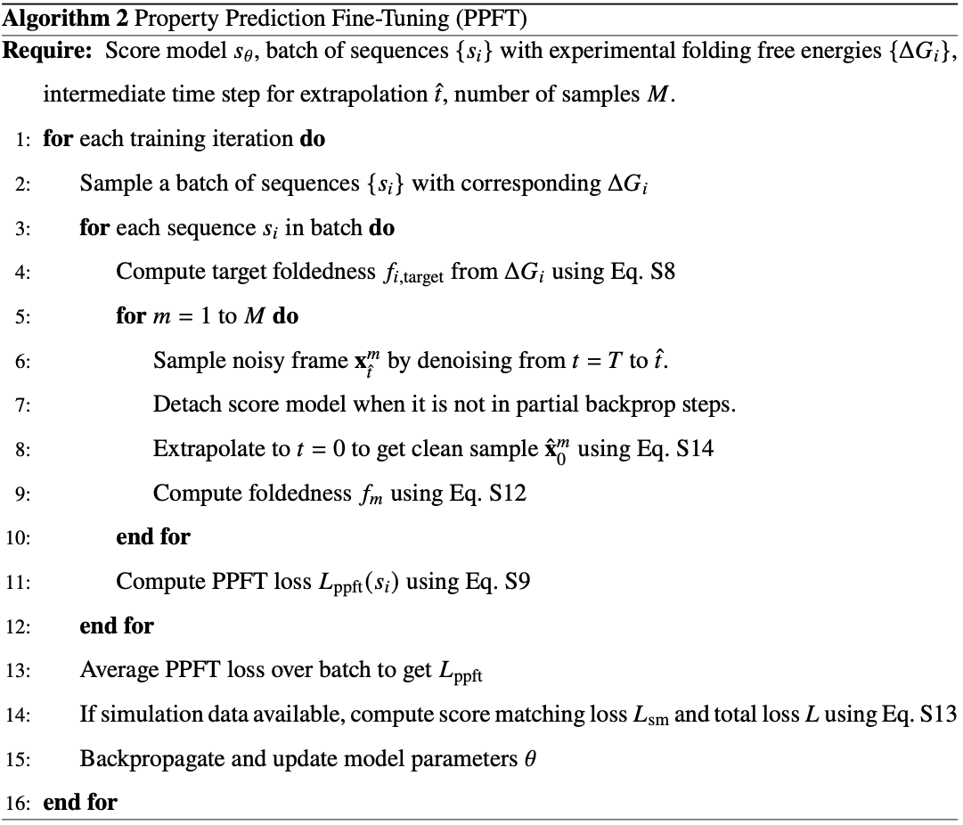 The PPFT innovation enables training on experimental observables without structural data. For the MEGAscale dataset (500,000+ stability measurements), BioEmu generates small ensembles (M~8-16 samples) using rapid approximate sampling, classifies each as folded/unfolded based on fraction of native contacts, computes ensemble-averaged foldedness, and minimizes squared error against the target derived from experimental ΔG via Boltzmann weighting.