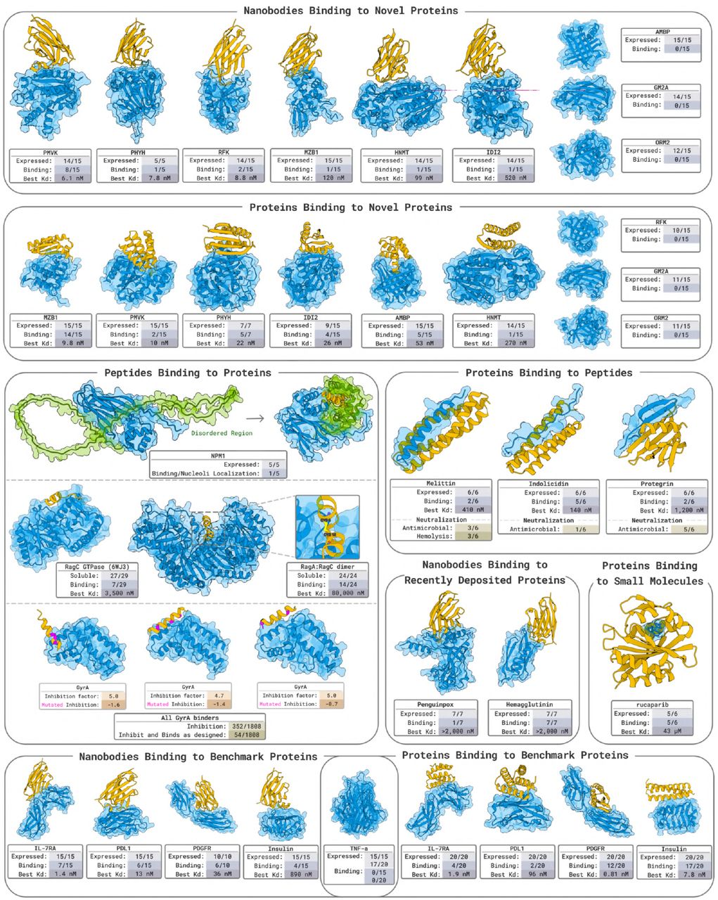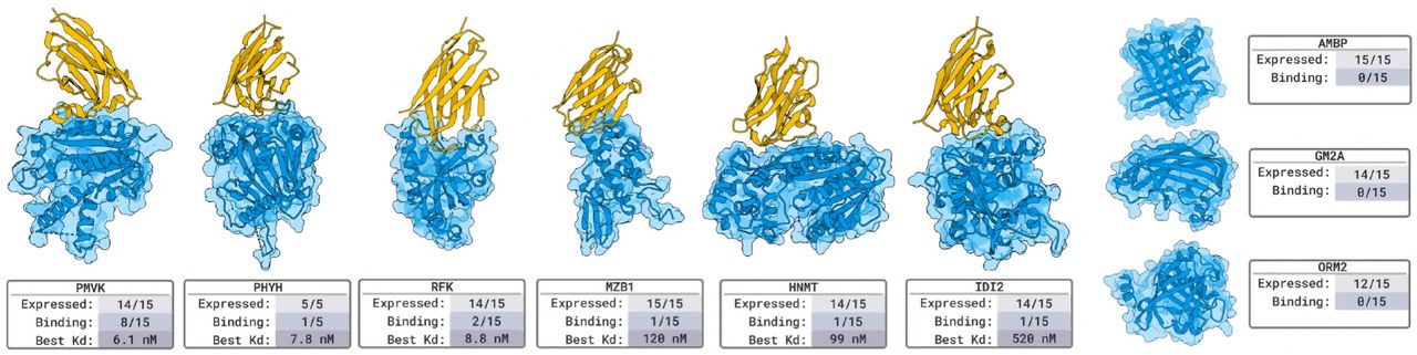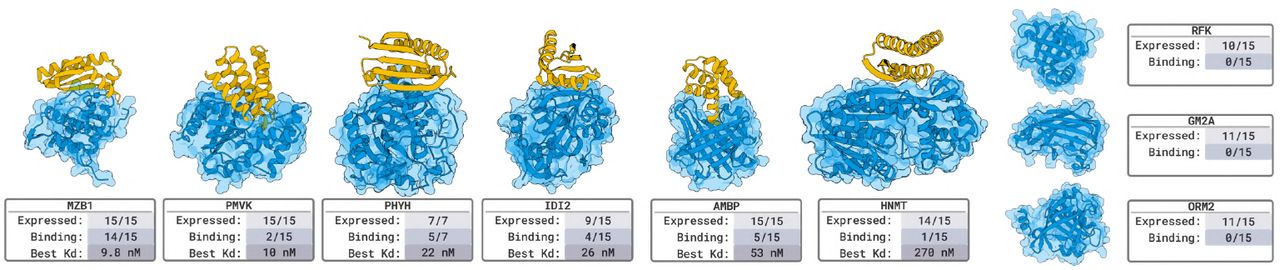 Figure 7: Miniprotein binder validation. Designed proteins (50-150 residues) against the same 9 novel targets. 6/9 target success rate. Highlights complementary success patterns to nanobodies, demonstrating modality-independent design capability. Source: Stark et al. 2025, Figure 3.