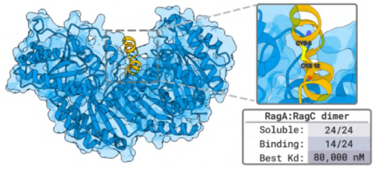 Figure 9: Disulfide-bonded cyclic peptide designs against RagA:RagC. 14/28 designs showed binding (50% success). Demonstrates DSL capability for constrained peptide geometries. Source: Stark et al. 2025.