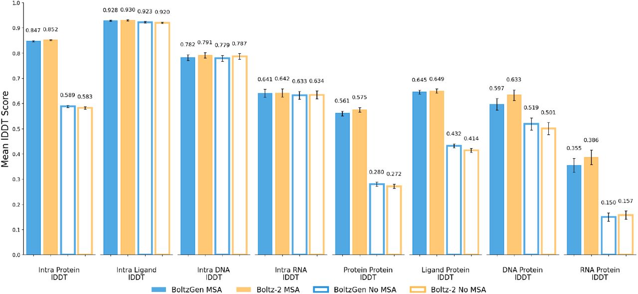Previous tools often validated on well-characterized therapeutic targets (PD-L1, TNFα, IL-7Rα) with numerous known binders. While useful for benchmarking, success on these targets may reflect similarity to training examples. BoltzGen’s 66% success on truly novel targets—including PMVK, AMBP, RFK, and MZB1—provides stronger evidence of generalizable design capability.