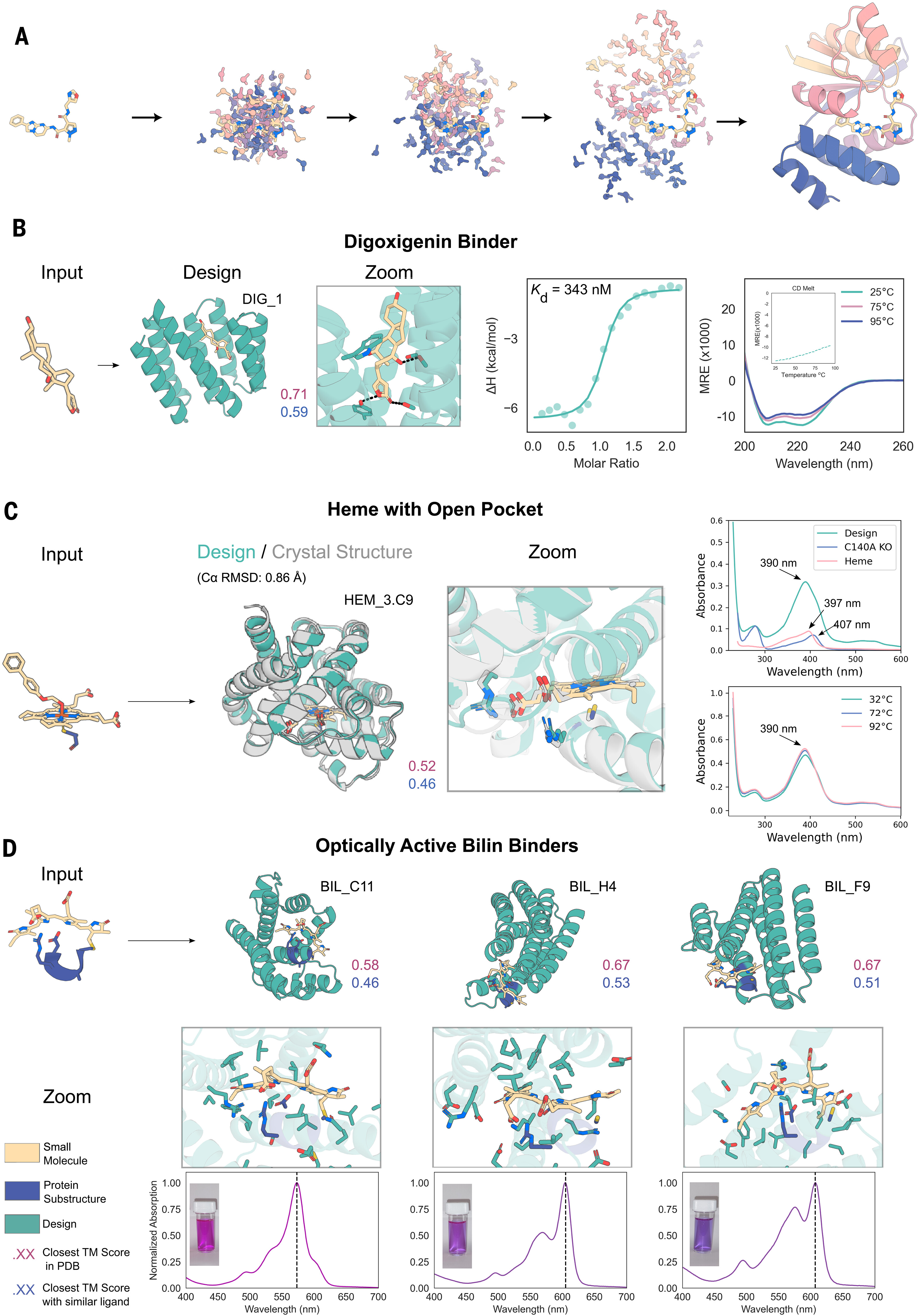 | RFDiffusionAA | All-atom diffusion | $\surd$ | Partial | 343 nM (digoxigenin) | $\surd$ |