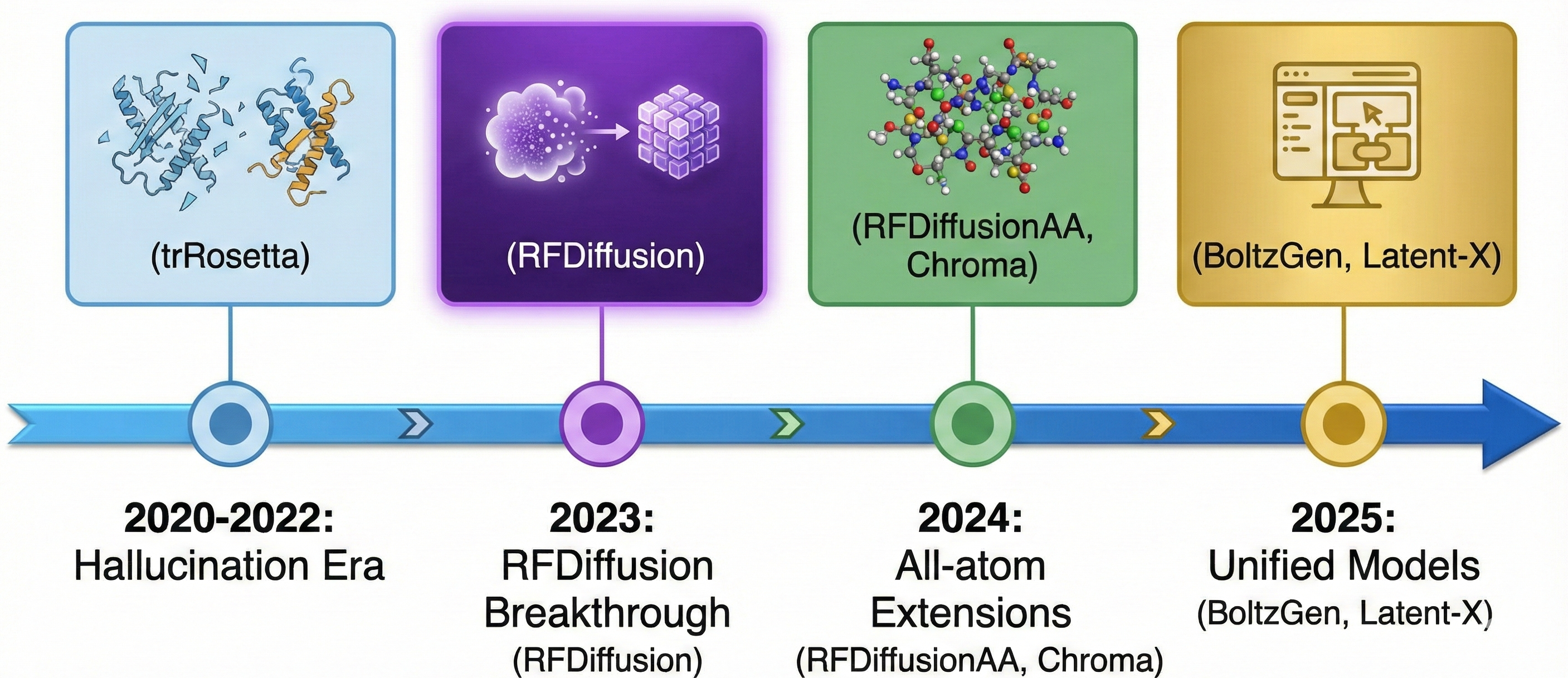 All-atom extension (2024): RFDiffusionAA, Chroma, and similar tools expanded to full atomic representations, enabling small molecule binder design and multi-modal targets. However, most still separated structure and sequence generation.