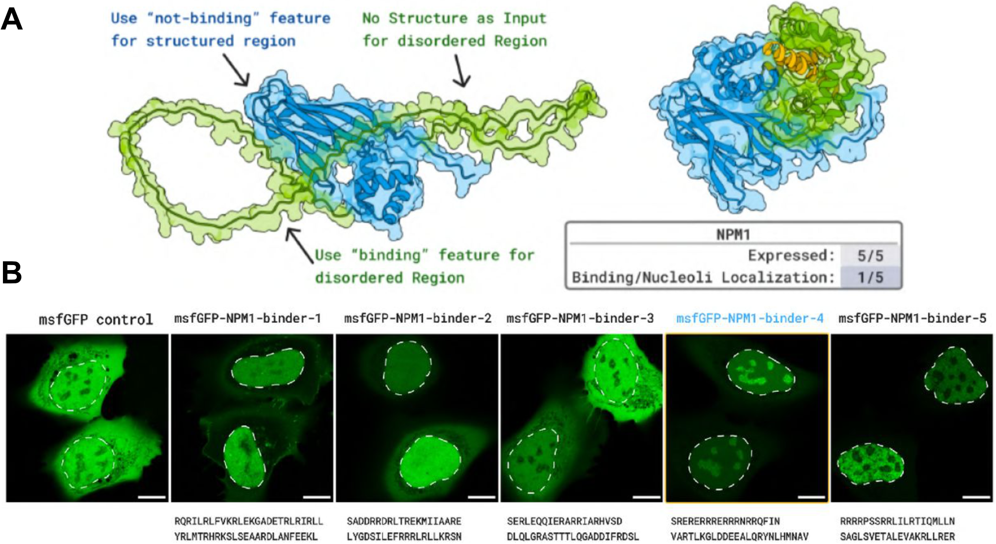 A landmark validation demonstrated peptide binding to NPM1’s intrinsically disordered C-terminal region, a driver of acute myeloid leukemia. One of five tested designs showed nucleolar localization in live human cells—the first evidence of de novo designed proteins binding disordered targets in vivo.