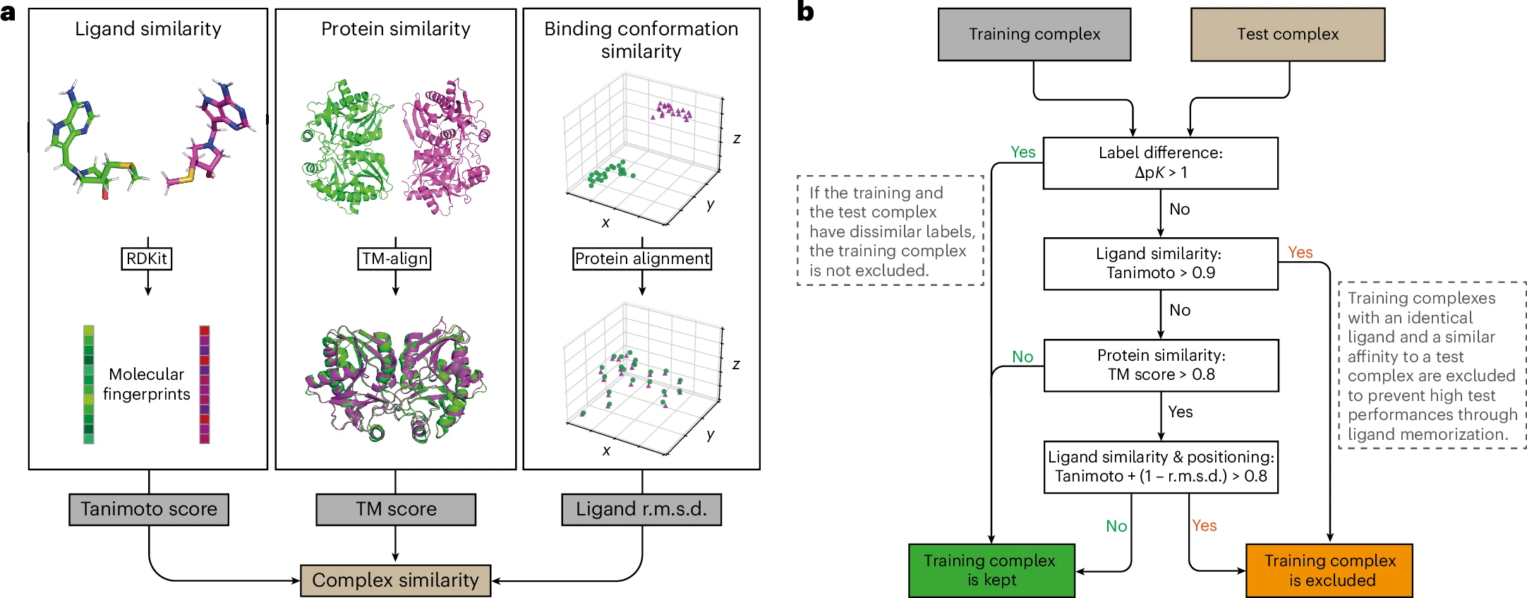 This multi-pronged filtering catches cases where proteins and ligands appear dissimilar by sequence/scaffold but adopt highly similar binding geometries.