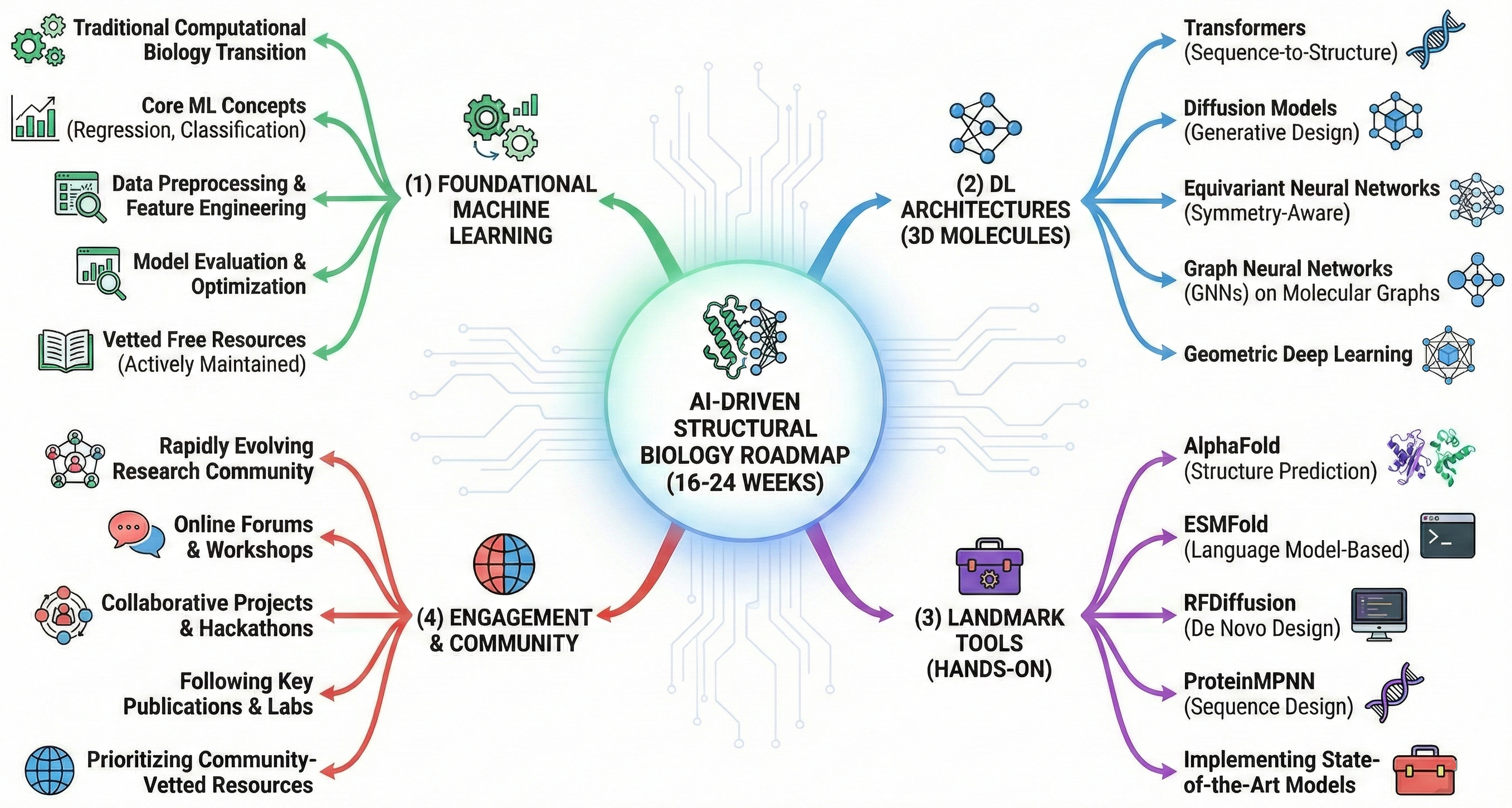 The transition from traditional computational biology to AI-driven structural biology requires mastering four pillars: (1) foundational machine learning, (2) deep learning architectures specific to 3D molecular structures (transformers, diffusion models, equivariant neural networks, GNNs), (3) hands-on experience with landmark tools (AlphaFold, ESMFold, RFDiffusion, ProteinMPNN), and (4) engagement with a rapidly evolving research community. This roadmap provides a 16-24 week structured pathway from ML fundamentals to implementing state-of-the-art protein structure prediction and design—prioritizing free, actively maintained resources vetted by the computational biology community.