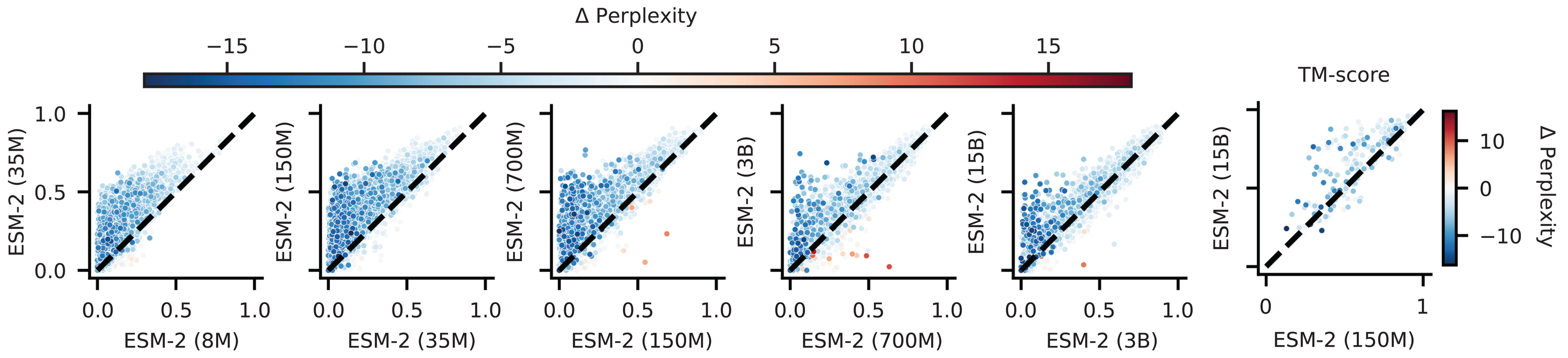 The scaling results revealed a striking pattern: contact prediction accuracy showed nonlinear jumps at specific scale thresholds, and a near-perfect correlation ($r = -0.99$) emerged between validation perplexity and structure prediction accuracy on CASP14. This correlation between language modeling performance and structural understanding suggests that predicting the next amino acid requires, at sufficient scale, implicit modeling of the structural constraints that make certain residues fit better than others. The 150M parameter ESM-2 already outperformed the 650M parameter ESM-1b on structure prediction benchmarks, demonstrating that architectural improvements compound with scale.