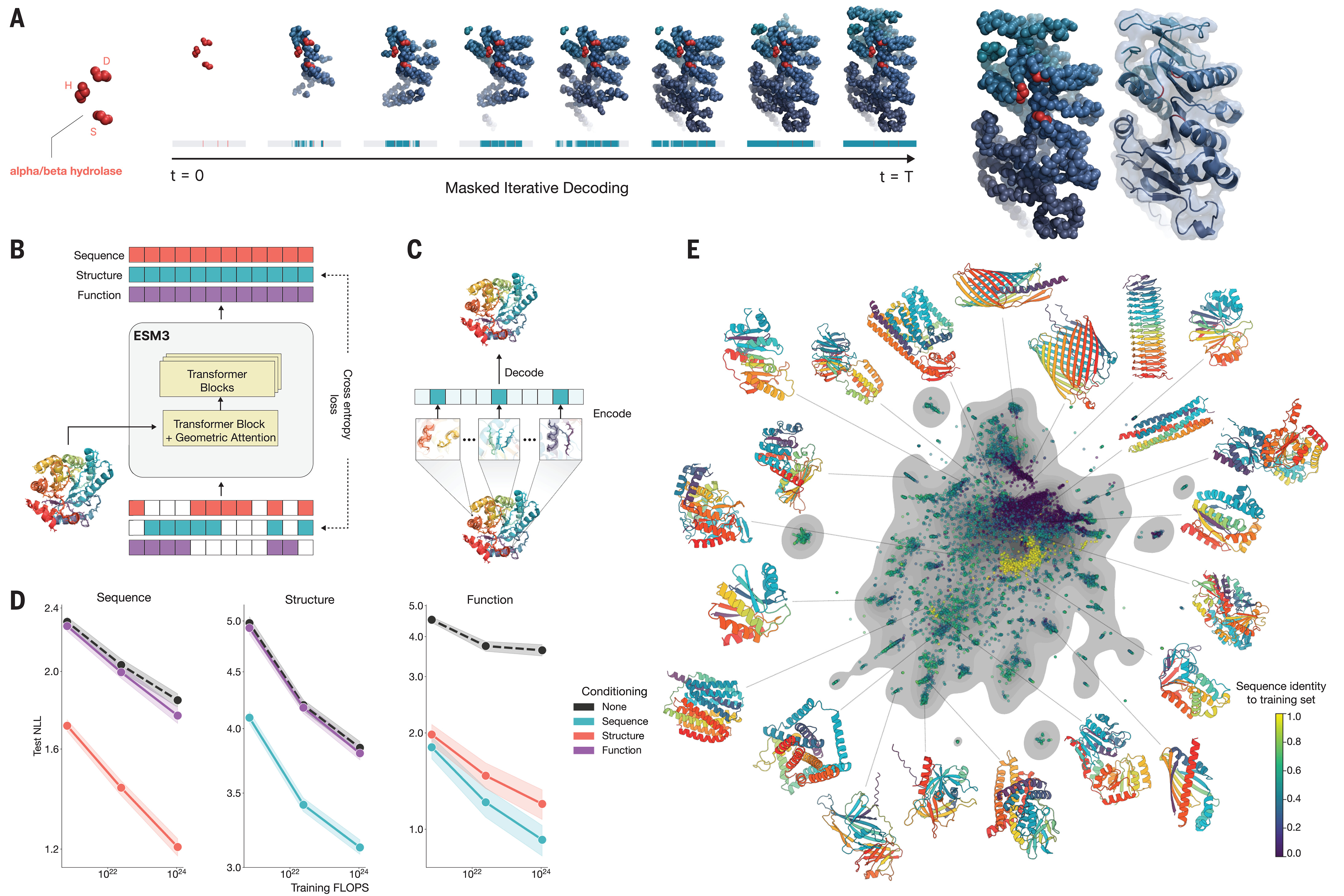 ESM-3, developed by EvolutionaryScale (the company founded by former Meta AI researchers in 2023) and published in Science in January 2025, fundamentally reconceives the ESM approach. Rather than a discriminative language model followed by a separate folding module, ESM-3 is a unified multimodal generative model that simultaneously reasons over sequence, structure, and function.