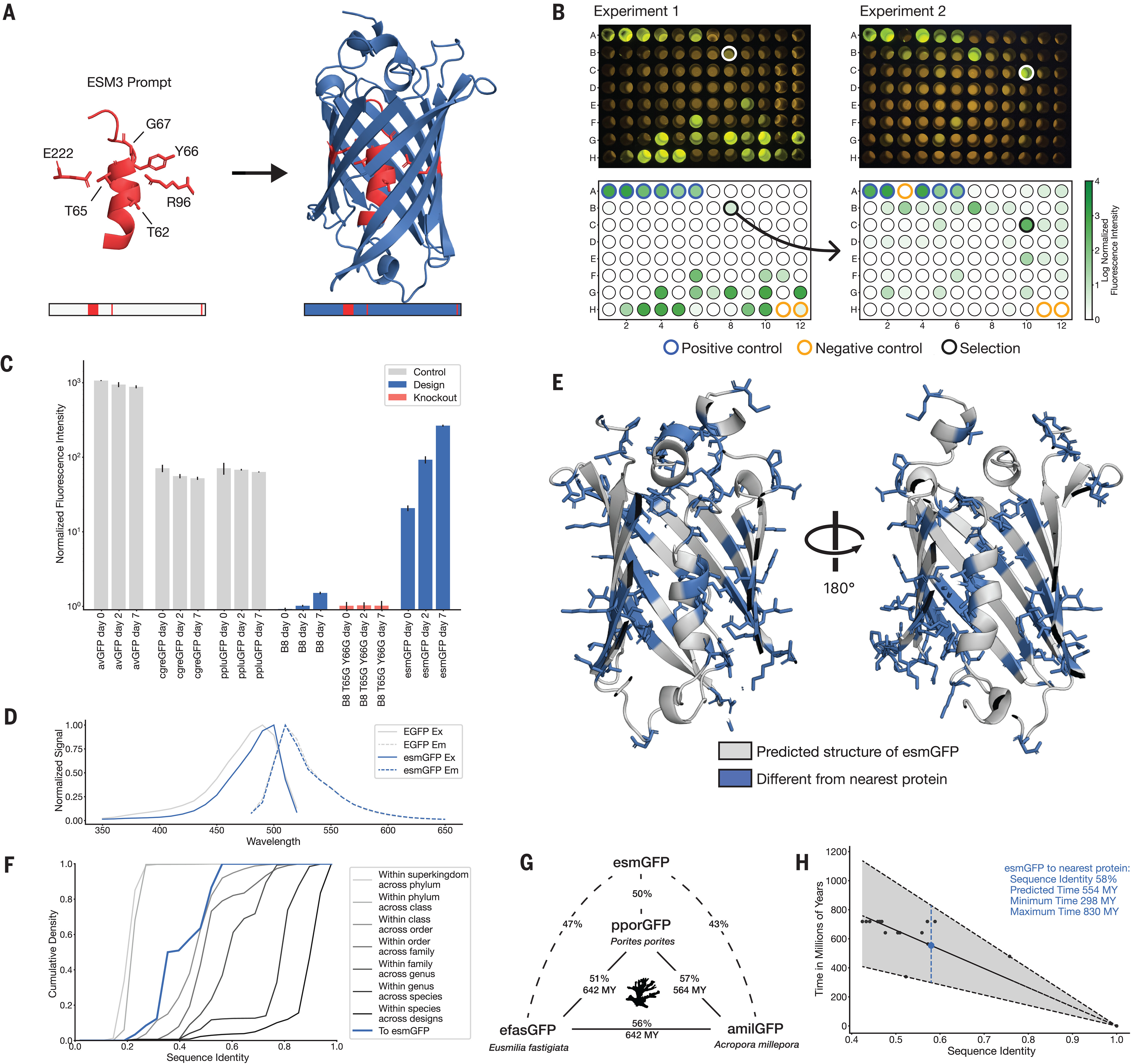 The most striking demonstration is esmGFP, a novel green fluorescent protein generated through chain-of-thought reasoning over sequences and structures. Starting from the chromophore-forming residue positions of natural GFP, ESM-3 generated a protein with 58% sequence identity to the nearest natural fluorescent protein—96 mutations across 229 residues, representing an evolutionary distance equivalent to approximately 500 million years of natural evolution. Critically, esmGFP spontaneously forms a fluorescent chromophore with peak emission at 512nm (identical to natural GFPs) and brightness comparable to wild-type proteins. This validates that ESM-3 captures enough protein biology to generate functional novelty far from its training distribution.