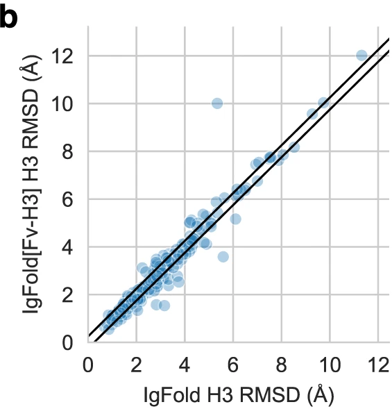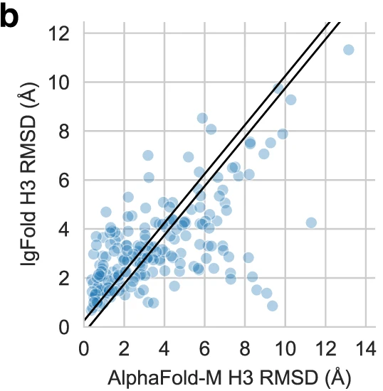 Figure 11: Per-target CDR H3 comparison between IgFold and AlphaFold-Multimer. Scatter plot comparing CDR H3 loop RMSD for IgFold (y-axis) versus AlphaFold-Multimer (x-axis) across 197 paired antibody benchmark targets. Each point represents one antibody structure. Diagonal bands indicate predictions within ±1 Å agreement. Approximately 20% of targets show >4 Å RMSD difference between methods (points far from diagonal), indicating the methods predict distinct CDR H3 conformations for the same sequence. This complementarity suggests ensemble approaches combining both predictions could improve conformational coverage. Points above diagonal represent cases where AlphaFold-Multimer outperforms IgFold; points below diagonal show IgFold superiority. Source: Ruffolo et al. 2023, Figure 2b.