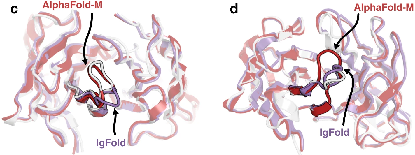 Figure 12: Contrasting CDR H3 predictions for representative targets. Structural comparisons highlighting cases where IgFold and AlphaFold-Multimer predict different CDR H3 conformations. (c) Target 7N3G with 10-residue CDR H3: AlphaFold-Multimer accurately predicts the native structure (RMSD = 0.98 Å, pink) while IgFold predicts an alternative conformation (RMSD = 4.69 Å, dark blue). (d) Target 7RNJ with 9-residue CDR H3: IgFold accurately captures the native "stretched twist" conformation (RMSD = 1.18 Å, dark blue) while AlphaFold-Multimer predicts an extended loop (RMSD = 3.46 Å, pink). Native structure shown in light gray. These examples illustrate that neither method universally outperforms the other—each captures structural features the other misses. Source: Ruffolo et al. 2023, Figure 2c-d.
