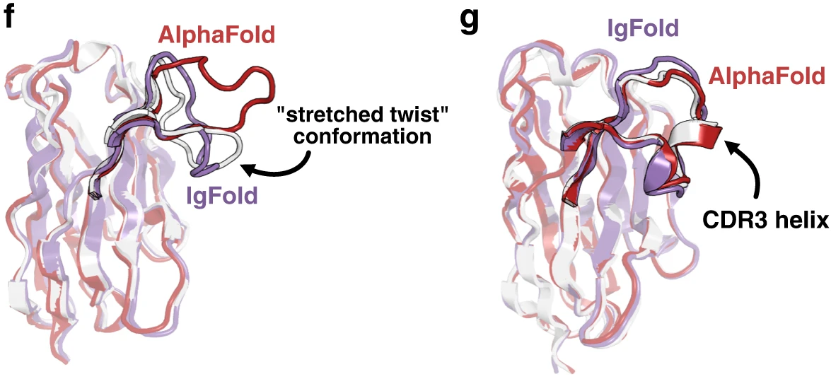 Figure 14: Nanobody CDR3 structural predictions. (f) Target 7AQZ with 15-residue CDR3 adopting the nanobody-specific "stretched-twist" conformation where the CDR3 loop bends to contact framework residues normally occupied by a light chain in paired antibodies. IgFold correctly predicts this nanobody-specific conformation (RMSD = 2.87 Å, purple) while AlphaFold predicts an extended loop inappropriate for single-domain antibodies (RMSD = 7.08 Å, pink). (g) Target 7AR0 with 17-residue CDR3 containing a short helical region. Both methods predict the correct overall loop conformation, but IgFold fails to predict the helical secondary structure (RMSD = 2.34 Å, purple) while AlphaFold accurately captures the helix (RMSD = 0.84 Å, pink). This highlights AlphaFold's advantage from training on diverse protein structures with varied secondary structure elements. Source: Ruffolo et al. 2023, Figure 2f-g.