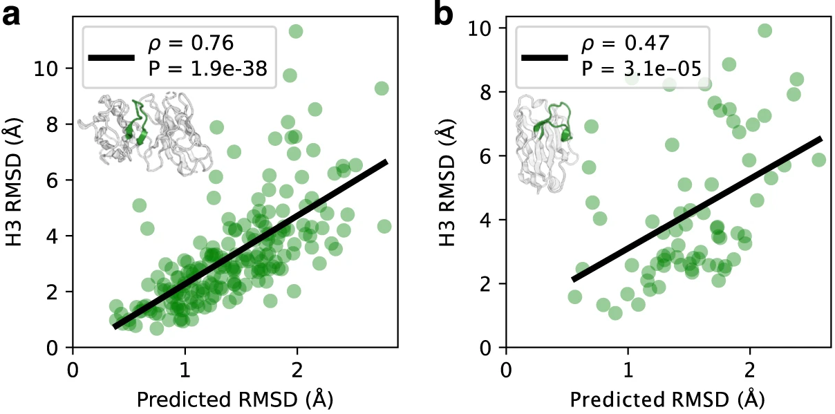 Figure 8: Correlation between predicted and actual CDR loop errors. Validation of IgFold's per-residue error estimation capability. (a) CDR H3 loops from paired antibody benchmark (n=197): predicted RMSD (x-axis) versus actual RMSD from native structure (y-axis) shows strong correlation (Spearman ρ = 0.76, p = 1.9×10⁻³⁸). (b) CDR3 loops from nanobody benchmark (n=71): moderate correlation (Spearman ρ = 0.47, p = 3.1×10⁻⁵). Points colored by predicted error (blue = low, red = high). Gray shaded region represents cumulative average RMSD of predictions. The error estimation model tends to underpredict actual RMSD, particularly for high-error cases, likely due to class imbalance between many low-RMSD framework residues and fewer high-RMSD CDR residues during training. Despite this miscalibration, the model effectively ranks prediction quality, enabling users to identify unreliable structures for experimental validation. Source: Ruffolo et al. 2023, Figure 3a-b.