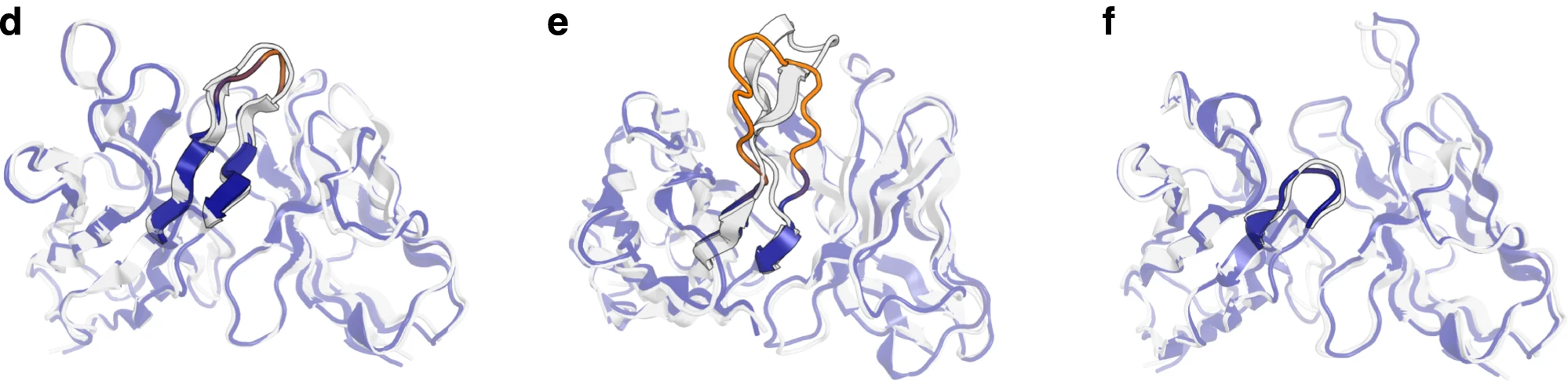 Figure 9: Examples of error-colored structural predictions. Representative structures showing per-residue error estimation. Structures colored by predicted $\text{Cα}$ deviation from native: blue (low error) to red (high error). (d) Benchmark target 7O4Y with accurately predicted 12-residue CDR H3 (RMSD = 1.64 Å)—appropriately assigned low predicted error (blue). (e) Benchmark target 7RKS with challenging 18-residue CDR H3 containing structured beta sheet elements. IgFold struggles with this long loop (RMSD = 6.33 Å, shown in orange/red) and correctly predicts high uncertainty. (f) Target 7O33 with very short 3-residue CDR H3, predicted accurately (RMSD = 1.49 Å) with correspondingly low error estimate (blue). Source: Ruffolo et al. 2023, Figure 3d-f.