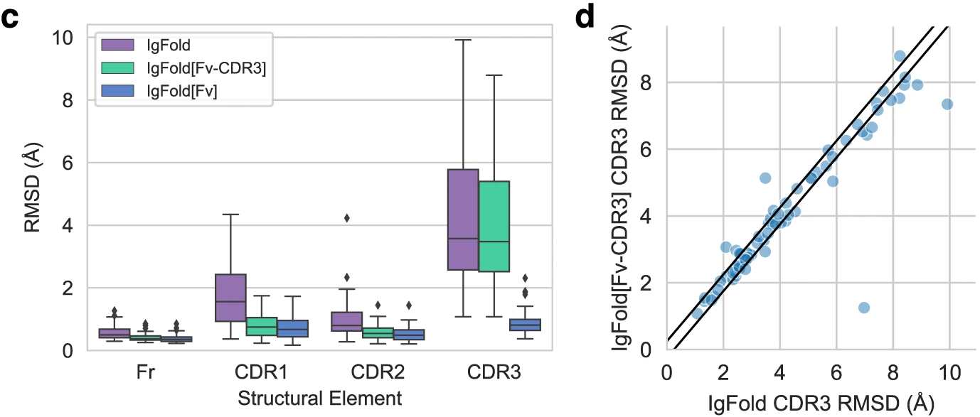 ImmuneBuilder (Abanades et al., Communications Biology 2023) uses a modified AlphaFold-Multimer architecture achieving CDR H3 RMSD of 2.81 Å—comparable to IgFold—while running 100× faster than AlphaFold-Multimer.