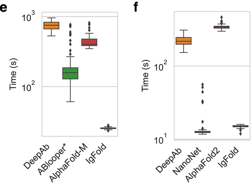Figure 15: Runtime comparison for paired antibody structure prediction. Wall-clock time from sequence to full-atom structure on identical hardware (12-core CPU, 1× A100 GPU) for 197 paired antibody benchmark targets. IgFold achieves median runtime of 23 seconds—approximately 19× faster than ColabFold's AlphaFold-Multimer implementation (435 seconds) and 33× faster than DeepAb (750 seconds). ABlooper appears faster at 174 seconds but this excludes framework prediction time (provided by IgFold here), making true runtime comparison difficult. IgFold's speed advantage stems from eliminating MSA construction (AlphaFold's primary bottleneck) through pre-trained language model embeddings that encode equivalent evolutionary information. DeepAb's slow runtime reflects expensive Rosetta minimization of predicted geometric constraints. Runtime comparison on 71 nanobody benchmark targets. IgFold requires median 15 seconds—23× faster than AlphaFold (345 seconds). NanoNet achieves similar speed (15 seconds) but with notably worse CDR3 accuracy (5.43 Å vs 4.25 Å). DeepAb averages 224 seconds for nanobodies—faster than its paired antibody runtime due to shorter total sequence length. The modest runtime difference between paired antibodies and nanobodies for each method reflects approximately linear scaling with sequence length. Source: Ruffolo et al. 2023, Figure 4e-f.