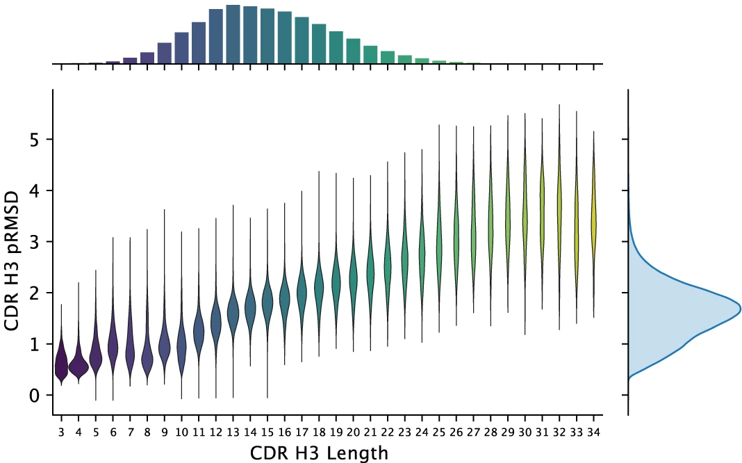 Figure 17: Predicted accuracy distribution for 1.3 million human antibody structures. Distribution of CDR H3 loop lengths (x-axis, histogram at top) and predicted RMSD (y-axis) for 1,340,180 unique paired human antibody sequences from four unrelated individuals. Violin plots show predicted RMSD distribution for each loop length. Median CDR H3 length is 13 residues with median predicted RMSD of 1.95 Å, indicating high-confidence predictions for the majority of structures. Predicted RMSD increases with loop length as expected—short loops (3-8 residues) typically predicted with <1.5 Å error while long loops (>20 residues) show higher uncertainty (>3 Å). This dataset represents a 500-fold expansion over experimentally determined antibody structures (~2,500 in PDB as of 2022), enabling unprecedented large-scale structural analysis of human antibody repertoires. Source: Ruffolo et al. 2023, Figure 4g.