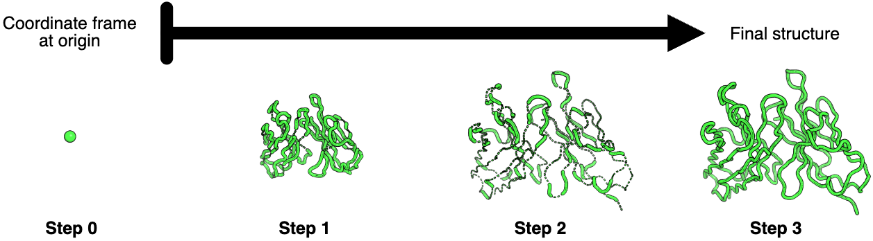 Figure 4: Stepwise coordinate prediction through invariant point attention layers. Progressive refinement of antibody structure through three IPA layers. Starting from initialization with all residue coordinate frames at the origin (Step 0, single green point), the first IPA layer (Step 1) predicts a compact arrangement resembling the final structure but at reduced scale. The second IPA layer (Step 2) expands the structure to approximately correct scale but with numerous chain breaks and abnormal bond geometries (visible as disconnected backbone segments). The third and final IPA layer (Step 3) resolves most geometric abnormalities, producing proper backbone connectivity and realistic bond lengths/angles. This sequential refinement strategy—global arrangement → correct scaling → local geometry—mirrors coarse-to-fine optimization approaches in computational structural biology. Minor remaining geometric imperfections are corrected during subsequent Rosetta refinement. Source: Ruffolo et al. 2023, Figure S2.