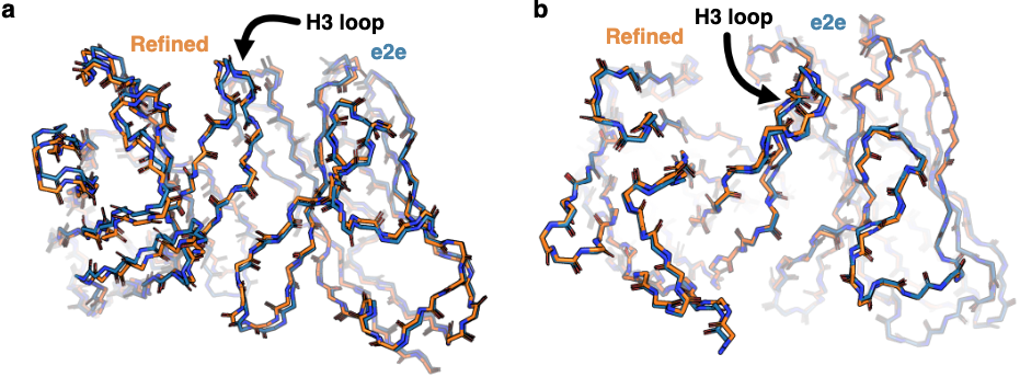 Figure 3: Minimal impact of refinement on prediction accuracy. (a) Comparison of structure prediction RMSD before (IgFold[e2e], orange) and after (IgFold, blue) Rosetta refinement on 197 paired antibody benchmark targets. Median RMSD changes are minimal ($\lt 0.5 Å$) for all structural elements, indicating that direct end-to-end predictions from IgFold's neural network are already geometrically reasonable. The exception is CDR H3, where some long loops show larger refinement effects due to pre-refinement bond length/angle abnormalities. (b) Scatter plots comparing pre- and post-refinement RMSD for each structural element. Points clustered near the diagonal (within gray bands) indicate minimal change. The few outliers represent long CDR loops or unusual structures requiring more extensive energy minimization. Source: Ruffolo et al. 2023, Figure S4a-b.