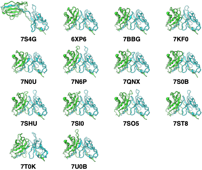 Figure 16: C-terminal strand swapping artifacts in AlphaFold-Multimer predictions. Representative examples of 14 paired antibody benchmark targets where AlphaFold-Multimer incorrectly predicts strand swaps between heavy (green) and light (cyan) chain C-terminal beta strands. In native antibody structures, each chain's C-terminal strand participates in its own immunoglobulin domain beta barrel. AlphaFold-Multimer occasionally predicts swapped architectures where heavy chain C-terminus integrates into light chain beta barrel and vice versa. This systematic error mode occurs in ~7% of benchmark predictions (14/197 targets) and results in elevated framework RMSD despite otherwise accurate structure prediction. IgFold's antibody-specific architecture does not exhibit this failure mode, likely due to training exclusively on correctly folded antibody structures rather than general protein complexes. Source: Ruffolo et al. 2023, Figure S5.