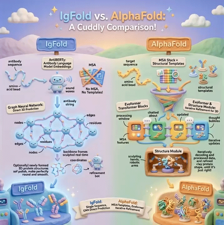 IgFold represents a synthesis of ideas from prior work while introducing key innovations. Understanding these differences illuminates the design decisions underlying IgFold’s performance.