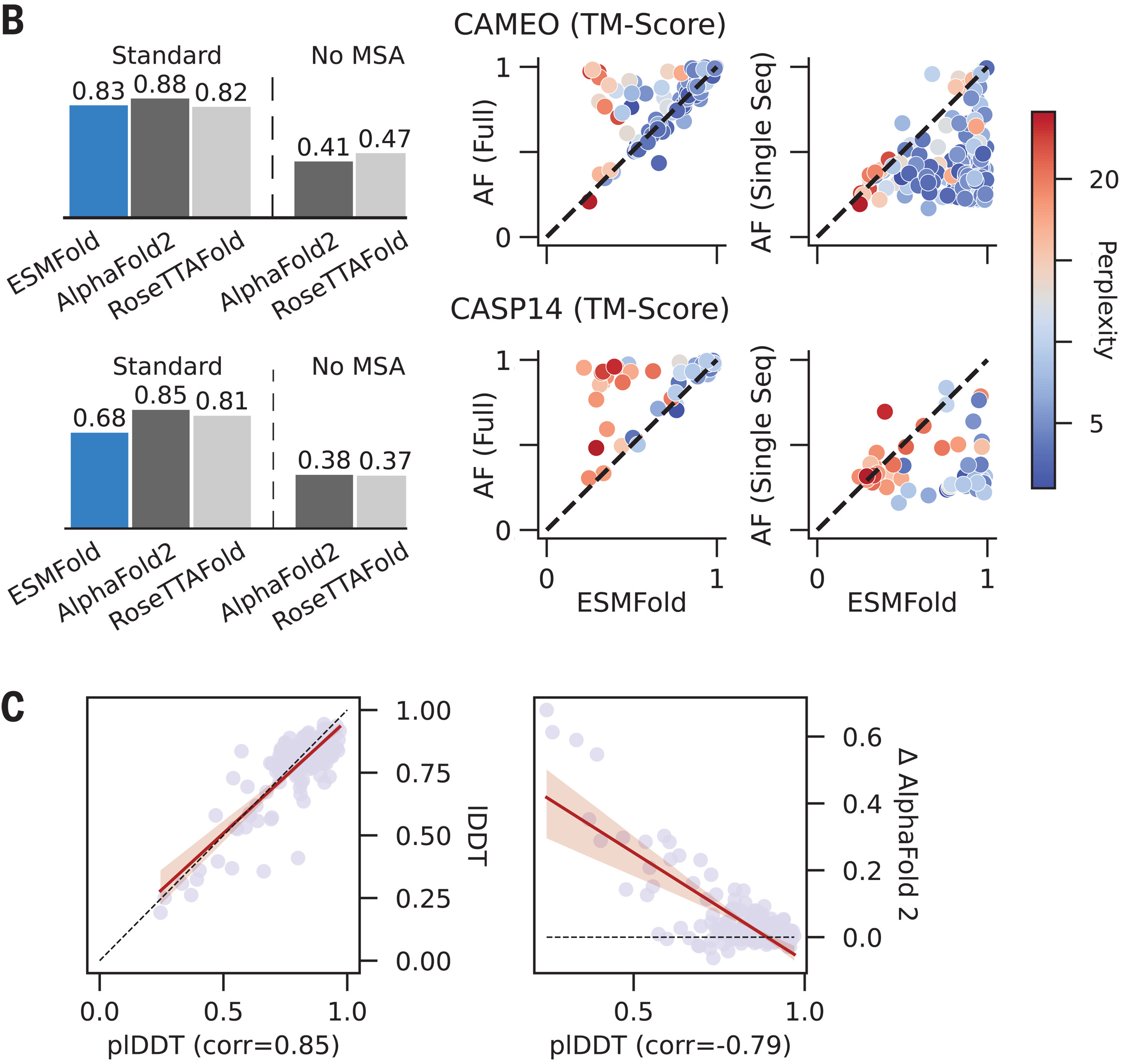 | Metric | ESMFold | AlphaFold2 (single seq) | AlphaFold2 (full MSA) |