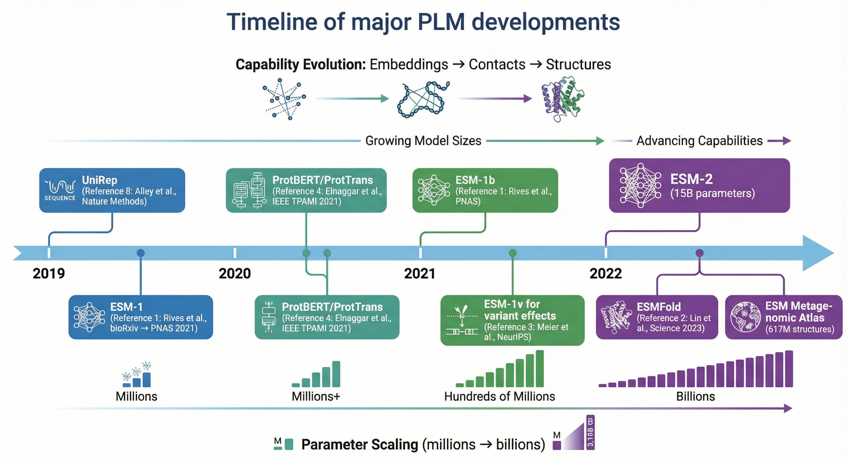 | ESM-1b | 650M | 33 | UniRef50 (250M seqs) | First large-scale PLM showing structural emergence |