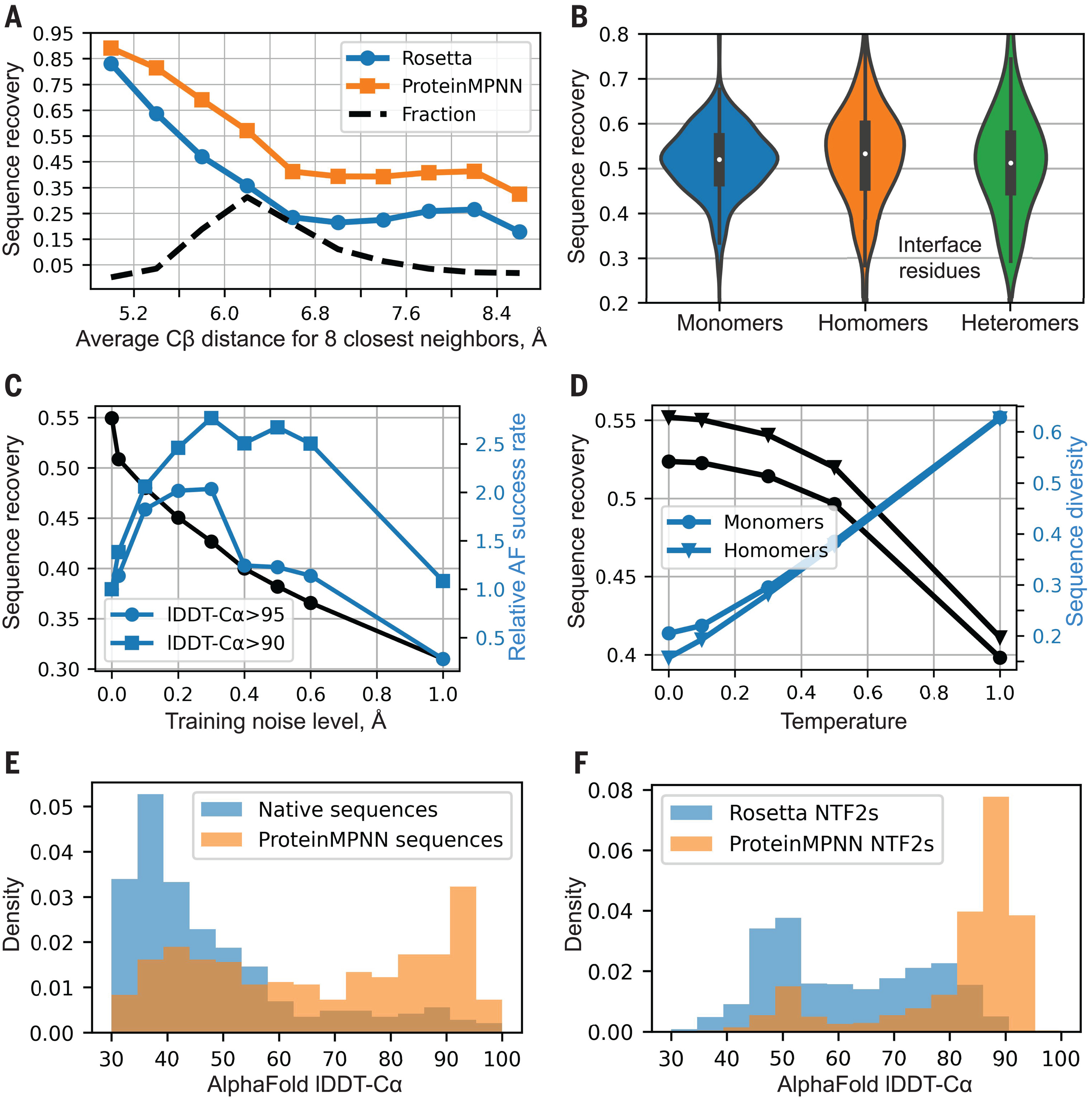 The noise-recovery tradeoff proved nuanced. Models trained with 0.02 Å noise achieved highest native sequence recovery on test crystal structures, but models trained with 0.20-0.30 Å noise generated 2-3 times more sequences whose AlphaFold predictions reached 90-95 lDDT-Cα scores. The default recommended model (v_48_020) uses 0.20 Å noise, balancing crystal structure recovery with robustness to the imperfect backbones typical in design applications. This insight—that the best test-set metric doesn’t guarantee the best design outcomes—reflects deeper lessons about machine learning for protein engineering.