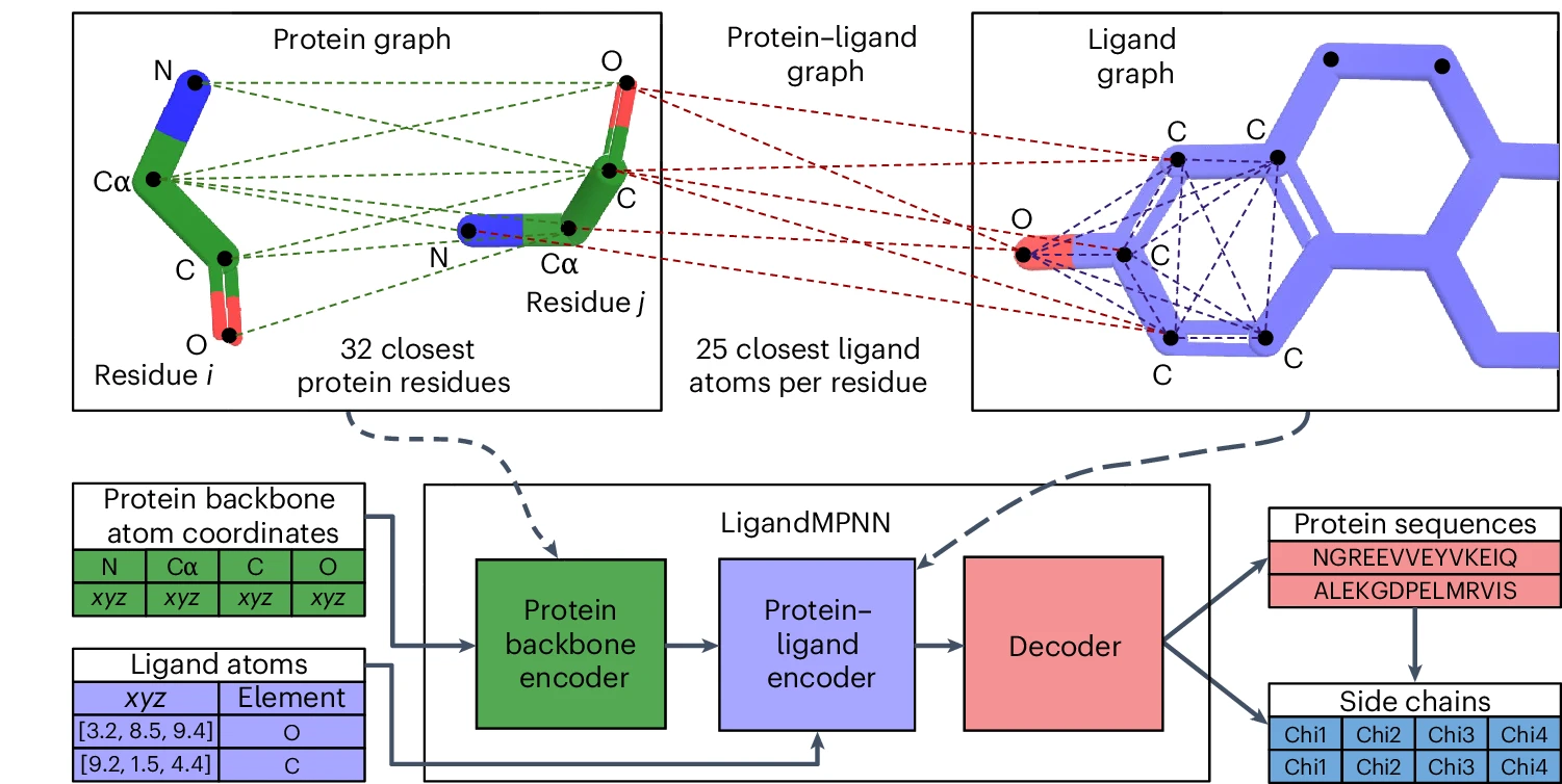 LigandMPNN, published in Nature Methods in 2025, represents the most significant ProteinMPNN extension. It introduces a three-graph architecture: the original protein backbone graph, an intra-ligand graph with atoms as nodes encoding element types and interatomic distances, and a protein-ligand graph connecting residues to nearby ligand atoms. Two additional message-passing layers process ligand information before the decoder, expanding model size to 2.62 million parameters while maintaining sub-second inference.